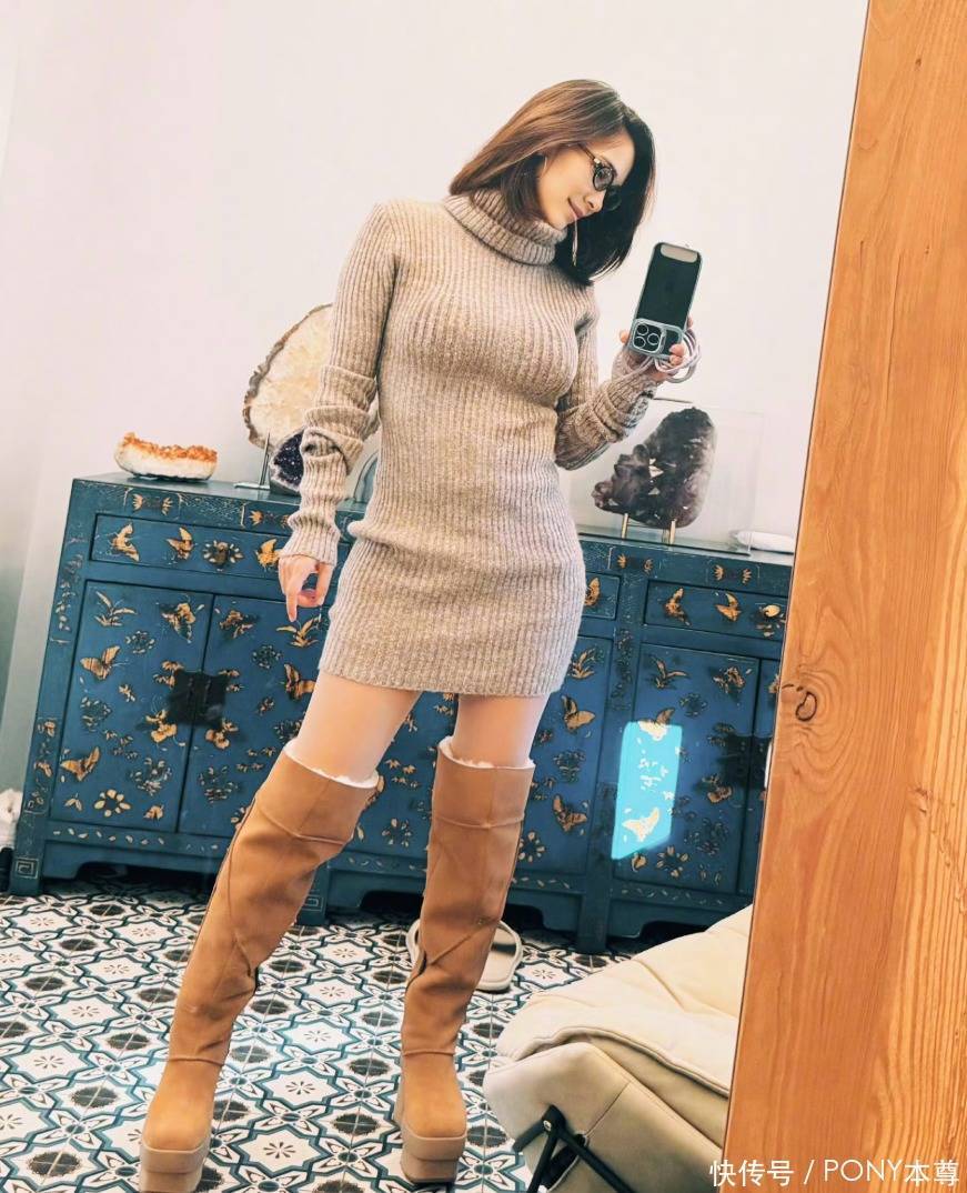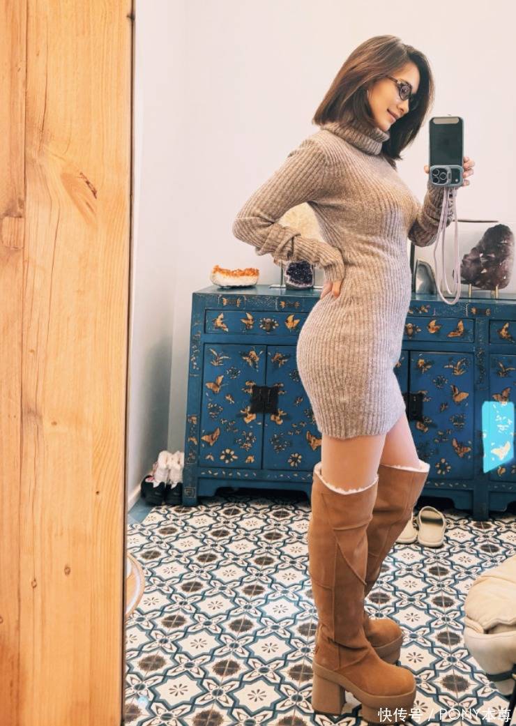 卢靖姗二胎后晒美照,穿棕色毛衣裙搭长筒雪地靴,身材恢复太好了